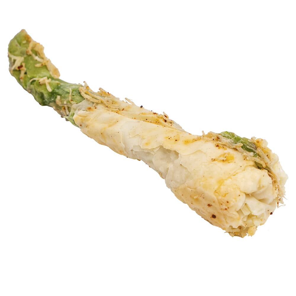 Crispy asparagus in phyllo is made with a fresh cut asparagus spear and the delicate flavors of asiago cheese, wrapped into a crispy phyllo roll.