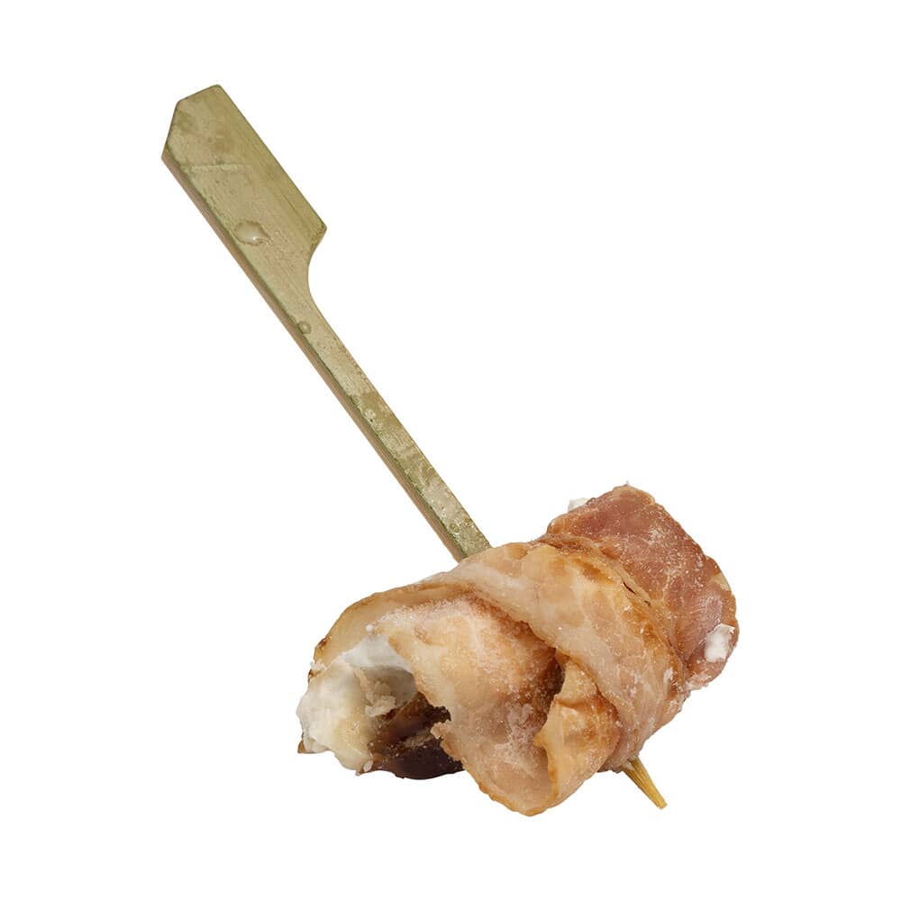 Sweet Medjool dates are stuffed with creamy goat cheese and wrapped in applewood smoked bacon, creating a perfectly balanced sweet-and-savory bite. Each date is presented on a bamboo paddle skewer for easy serving and polished presentation.