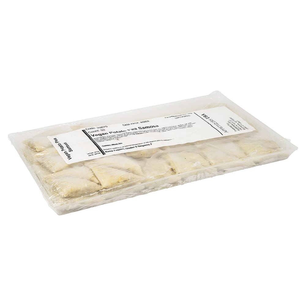 A very popular Indian dish, we use a crispy vegan pastry and fill it with tender potatoes, fresh green peas, carrots, scallions, garam marsala, cilantro, garlic and traditional spices. -